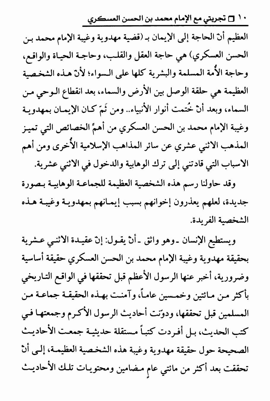 نام کتاب : تجربتي مع الامام محمد بن الحسن العسكري ، المنهج الصحيح في عرض حقيقة غيبة الإمام المهدي على الوهابيين نویسنده : الدكتور عصام العماد جلد : 1 صفحه : 10