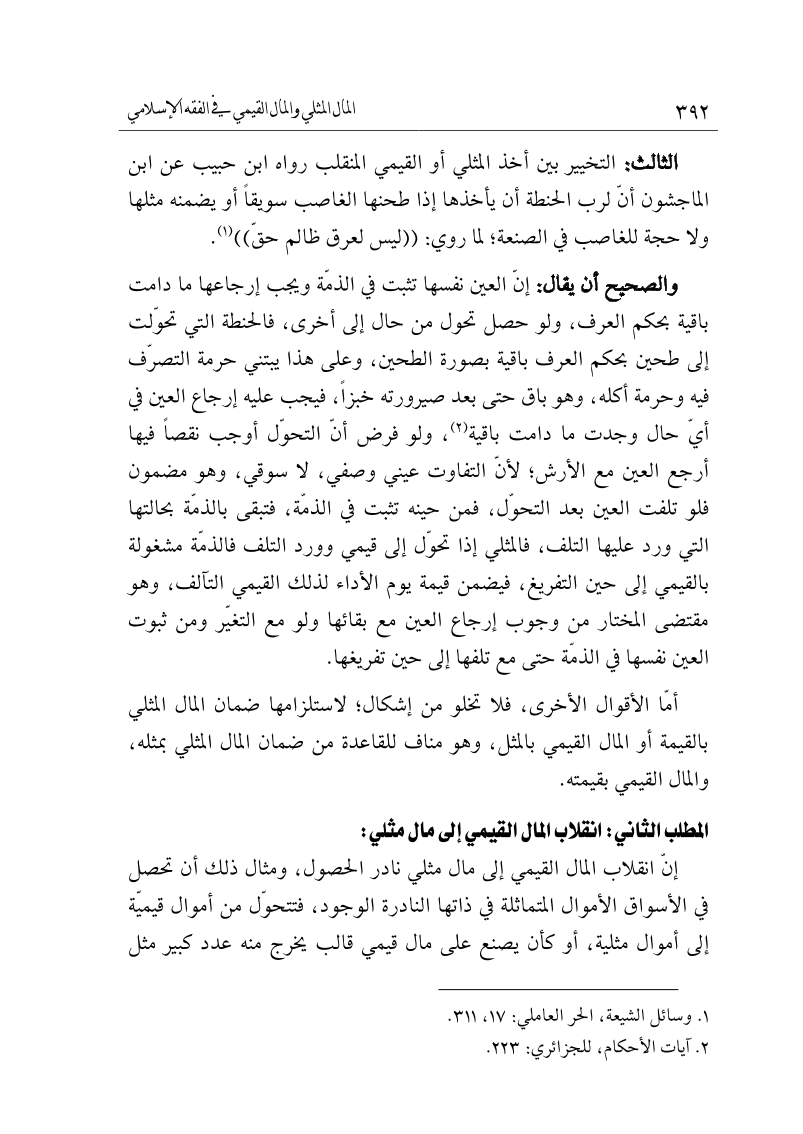 المال المثلي والمال القيمي في الفقه الإسلامي