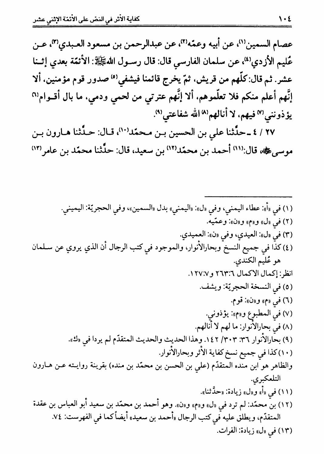 كفاية الأثر، في النصوص على الأئمة الإثني عشر