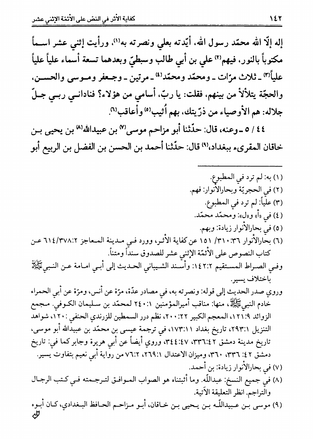 كفاية الأثر، في النصوص على الأئمة الإثني عشر