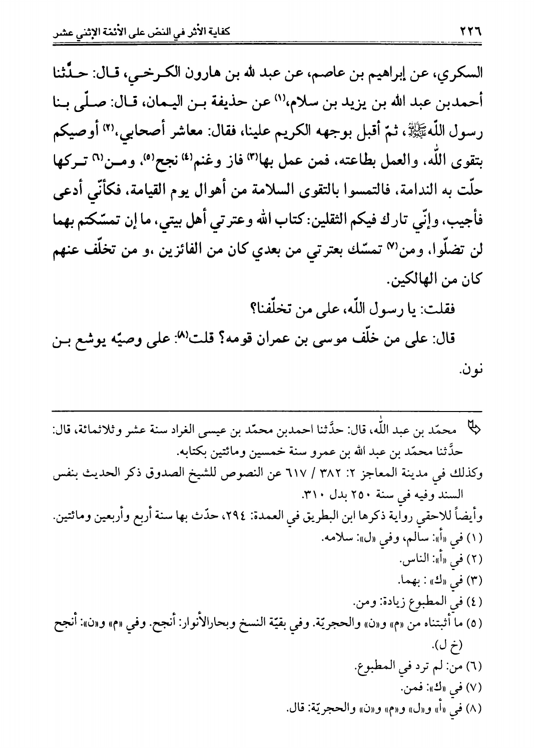 كفاية الأثر، في النصوص على الأئمة الإثني عشر