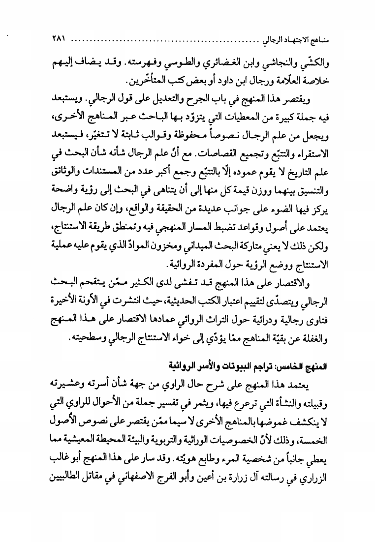 نام کتاب : الإجتهاد والتقليد في علم الرجال، وأثره في التراث العقائدي، دراسة نقدية لمدرسة النجاشي نویسنده : الشيخ محمد السند البحراني جلد : 1 صفحه : 281