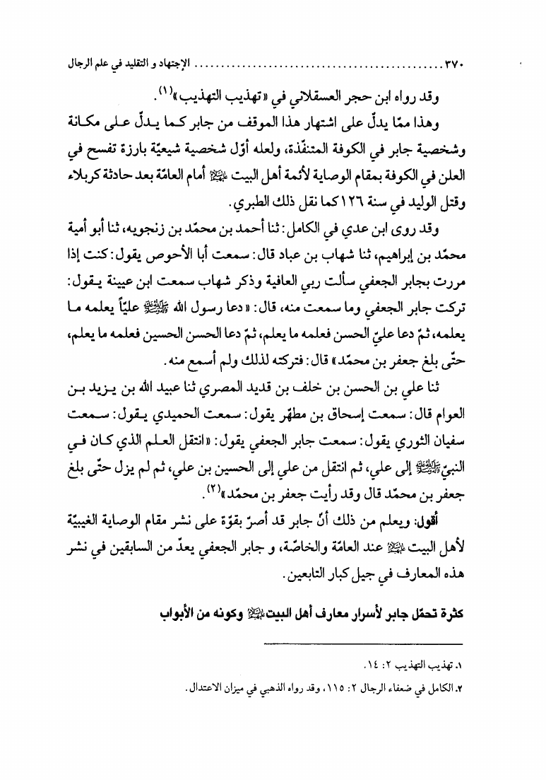 نام کتاب : الإجتهاد والتقليد في علم الرجال، وأثره في التراث العقائدي، دراسة نقدية لمدرسة النجاشي نویسنده : الشيخ محمد السند البحراني جلد : 1 صفحه : 370