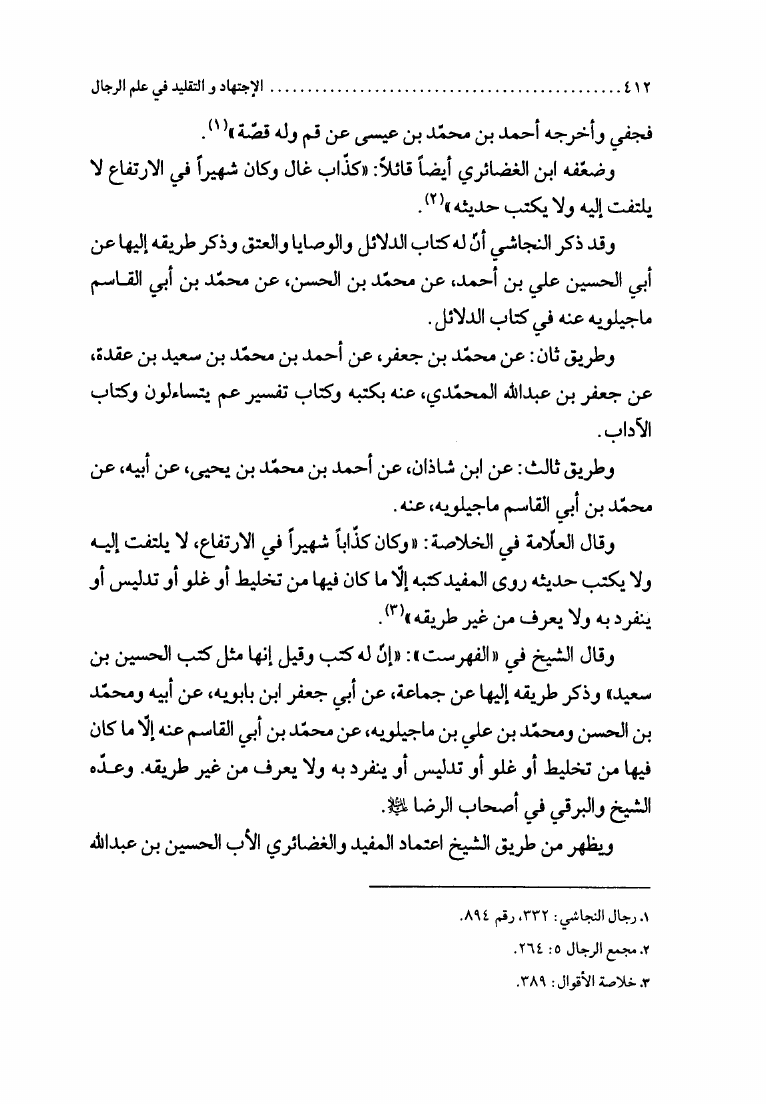 نام کتاب : الإجتهاد والتقليد في علم الرجال، وأثره في التراث العقائدي، دراسة نقدية لمدرسة النجاشي نویسنده : الشيخ محمد السند البحراني جلد : 1 صفحه : 412