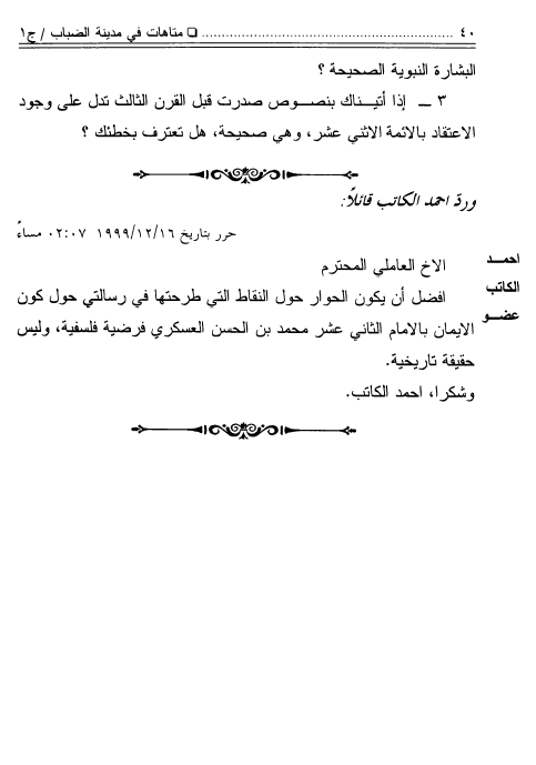 نام کتاب : متاهات في مدينة الضباب، حوار مع أحمد الكاتب حول الإمام المهدي عليه السلام - ج1 ج2 نویسنده : جمع وإعداد لجنة هجر الثقافية جلد : 1 صفحه : 40