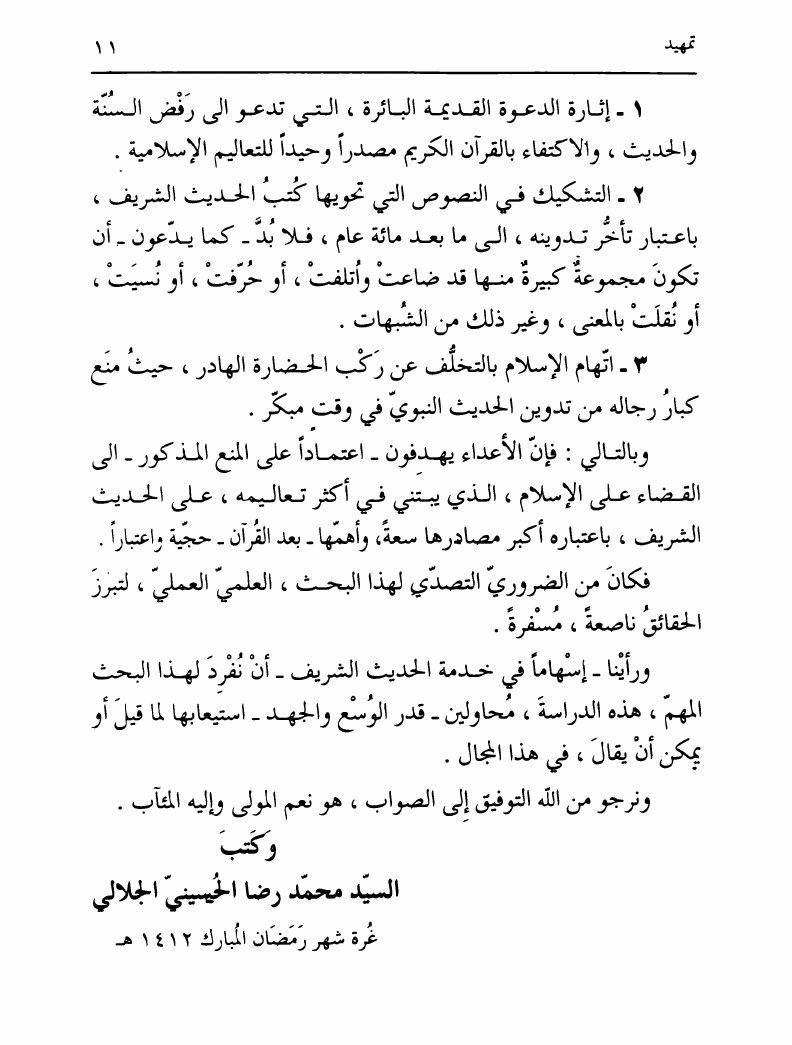 نام کتاب : تدوين السنة الشريفة، بدايته المبكرة في عهد الرسول ص ومصيره في عهود الخلفاء إلى نهاية القرن الأول نویسنده : السيد محمد رضا الحسيني الجلالي جلد : 1 صفحه : 11
