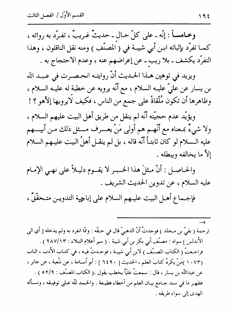نام کتاب : تدوين السنة الشريفة، بدايته المبكرة في عهد الرسول ص ومصيره في عهود الخلفاء إلى نهاية القرن الأول نویسنده : السيد محمد رضا الحسيني الجلالي جلد : 1 صفحه : 194
