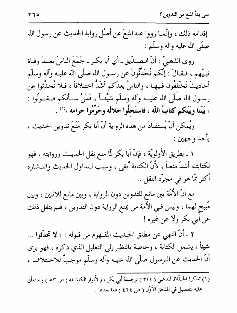 نام کتاب : تدوين السنة الشريفة، بدايته المبكرة في عهد الرسول ص ومصيره في عهود الخلفاء إلى نهاية القرن الأول نویسنده : السيد محمد رضا الحسيني الجلالي جلد : 1 صفحه : 265