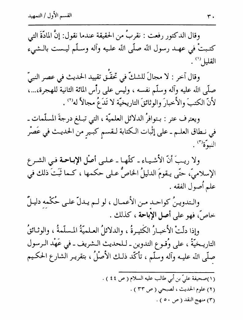 نام کتاب : تدوين السنة الشريفة، بدايته المبكرة في عهد الرسول ص ومصيره في عهود الخلفاء إلى نهاية القرن الأول نویسنده : السيد محمد رضا الحسيني الجلالي جلد : 1 صفحه : 30