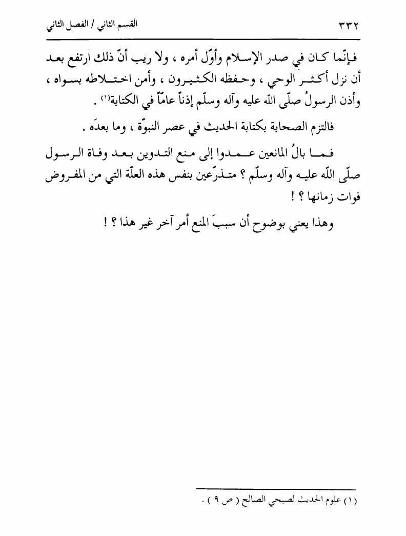 نام کتاب : تدوين السنة الشريفة، بدايته المبكرة في عهد الرسول ص ومصيره في عهود الخلفاء إلى نهاية القرن الأول نویسنده : السيد محمد رضا الحسيني الجلالي جلد : 1 صفحه : 332