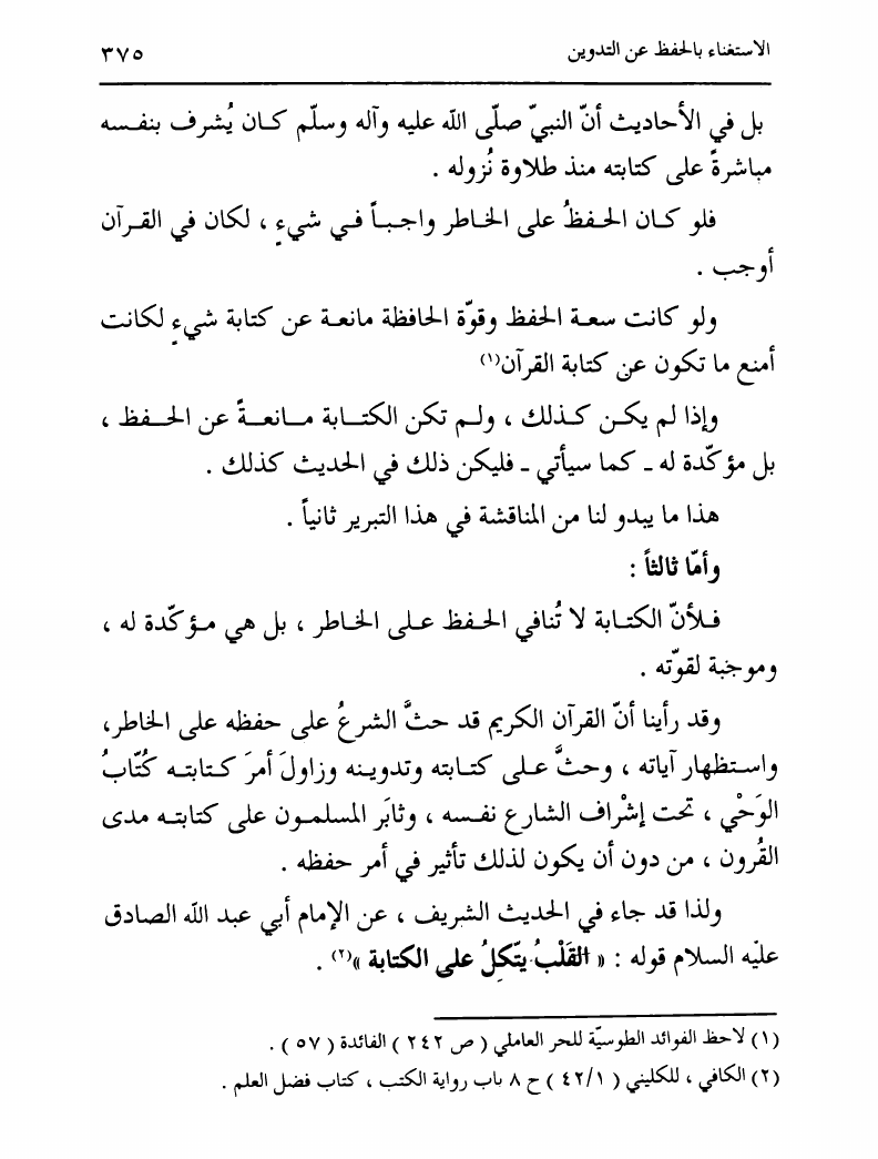 نام کتاب : تدوين السنة الشريفة، بدايته المبكرة في عهد الرسول ص ومصيره في عهود الخلفاء إلى نهاية القرن الأول نویسنده : السيد محمد رضا الحسيني الجلالي جلد : 1 صفحه : 375