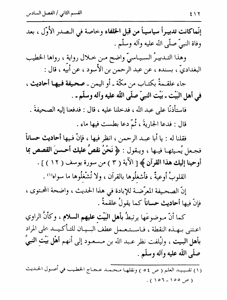 نام کتاب : تدوين السنة الشريفة، بدايته المبكرة في عهد الرسول ص ومصيره في عهود الخلفاء إلى نهاية القرن الأول نویسنده : السيد محمد رضا الحسيني الجلالي جلد : 1 صفحه : 412