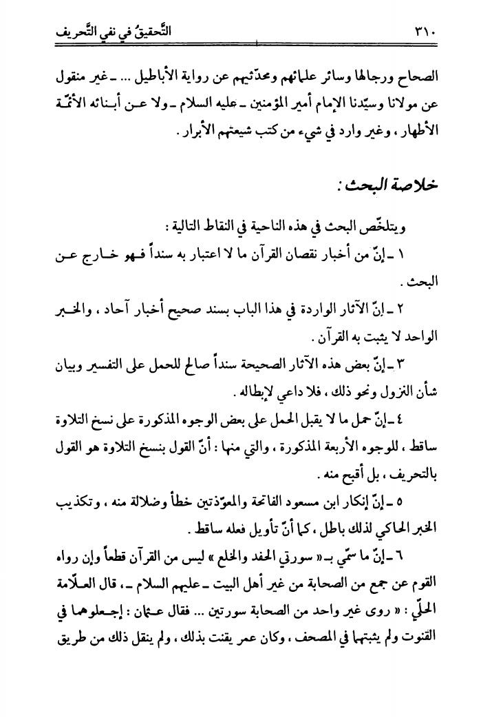 التحقيق في نفي التحريف، عن القرآن الشريف
