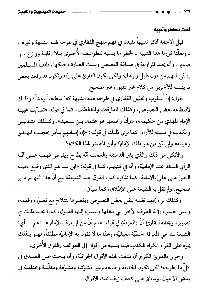 نام کتاب : حقيقة المهدوية و الغيبة، دراسة تأصيليّة نقديّة لشبهات الدكتور ناصر بن عبدالله القفاري في كتابه أصول مذهب الشيعة نویسنده : الدكتور يحيى عبد الحسن الدوخي جلد : 1 صفحه : 176