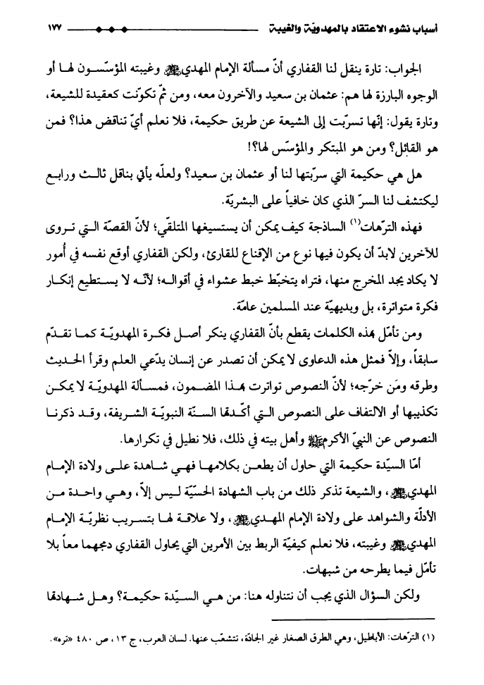 نام کتاب : حقيقة المهدوية و الغيبة، دراسة تأصيليّة نقديّة لشبهات الدكتور ناصر بن عبدالله القفاري في كتابه أصول مذهب الشيعة نویسنده : الدكتور يحيى عبد الحسن الدوخي جلد : 1 صفحه : 177
