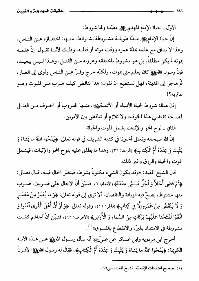 نام کتاب : حقيقة المهدوية و الغيبة، دراسة تأصيليّة نقديّة لشبهات الدكتور ناصر بن عبدالله القفاري في كتابه أصول مذهب الشيعة نویسنده : الدكتور يحيى عبد الحسن الدوخي جلد : 1 صفحه : 186
