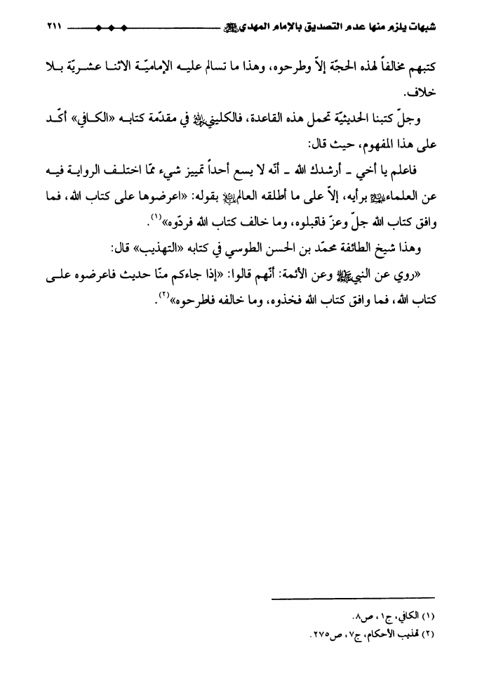 نام کتاب : حقيقة المهدوية و الغيبة، دراسة تأصيليّة نقديّة لشبهات الدكتور ناصر بن عبدالله القفاري في كتابه أصول مذهب الشيعة نویسنده : الدكتور يحيى عبد الحسن الدوخي جلد : 1 صفحه : 211