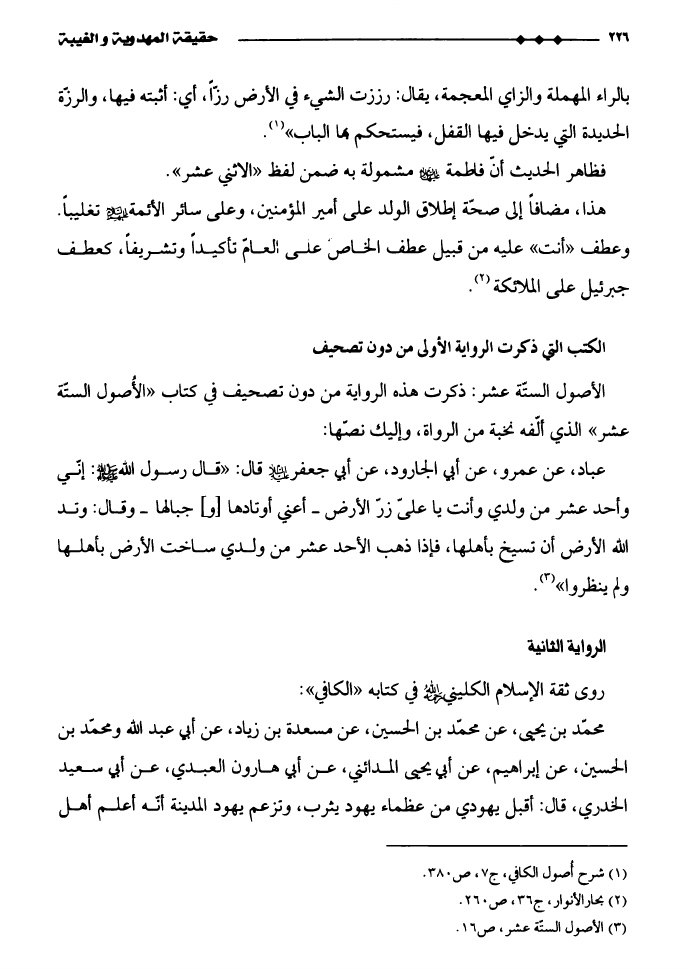نام کتاب : حقيقة المهدوية و الغيبة، دراسة تأصيليّة نقديّة لشبهات الدكتور ناصر بن عبدالله القفاري في كتابه أصول مذهب الشيعة نویسنده : الدكتور يحيى عبد الحسن الدوخي جلد : 1 صفحه : 226