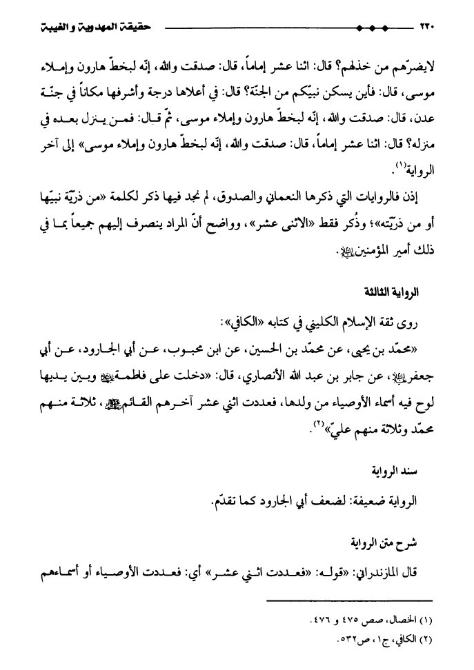 نام کتاب : حقيقة المهدوية و الغيبة، دراسة تأصيليّة نقديّة لشبهات الدكتور ناصر بن عبدالله القفاري في كتابه أصول مذهب الشيعة نویسنده : الدكتور يحيى عبد الحسن الدوخي جلد : 1 صفحه : 230