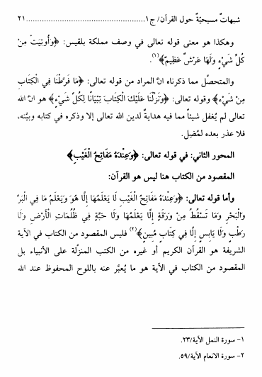 نام کتاب : شبهات مسيحية حول القرآن الكريم، يتصدى للرد على عدد من دعاوى التناقض بين آيات من القرآن المجيد - ج1 ج2 نویسنده : الشيخ محمد صنقور علي البحراني جلد : 1 صفحه : 21