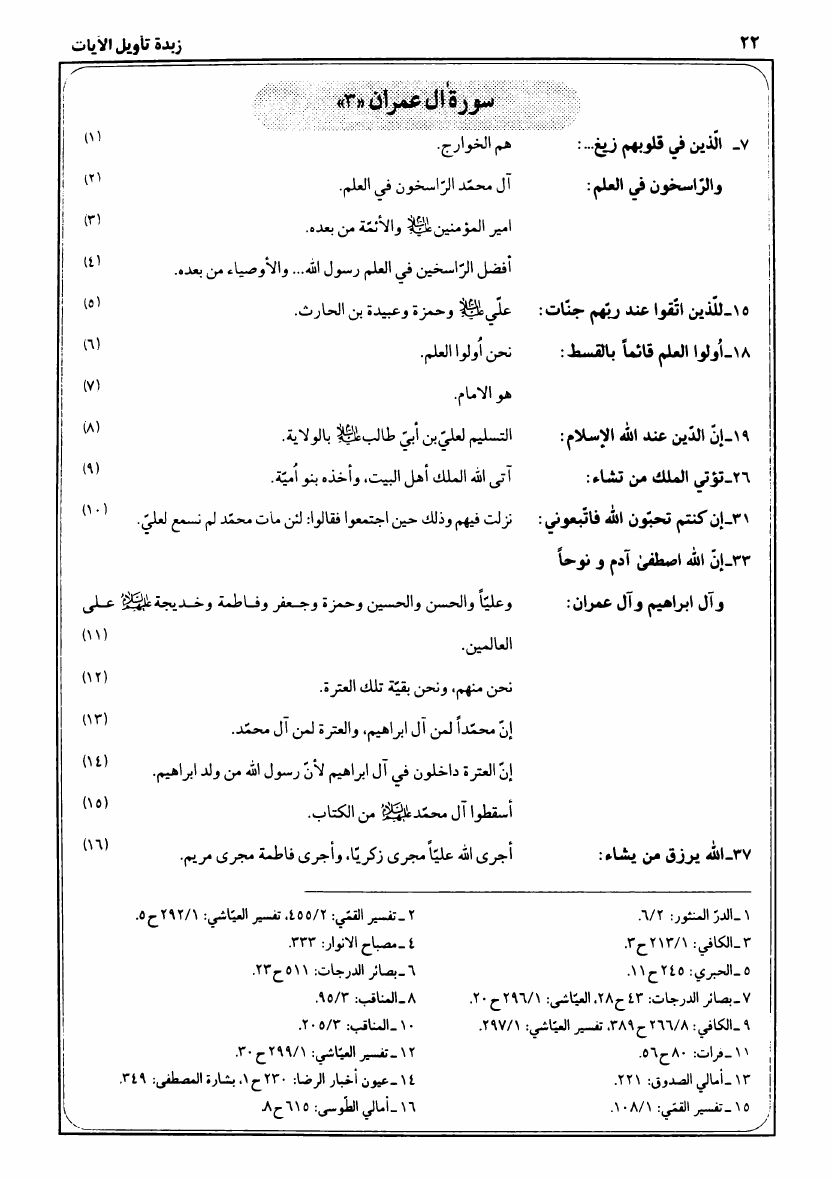نام کتاب : زبدة تأويل الآيات النازلة في فضائل العترة الطاهرة ع، بديعة مأثورة من كتب التفسير والرواية نویسنده : السيد محمد باقر موحد الأبطحي جلد : 1 صفحه : 22