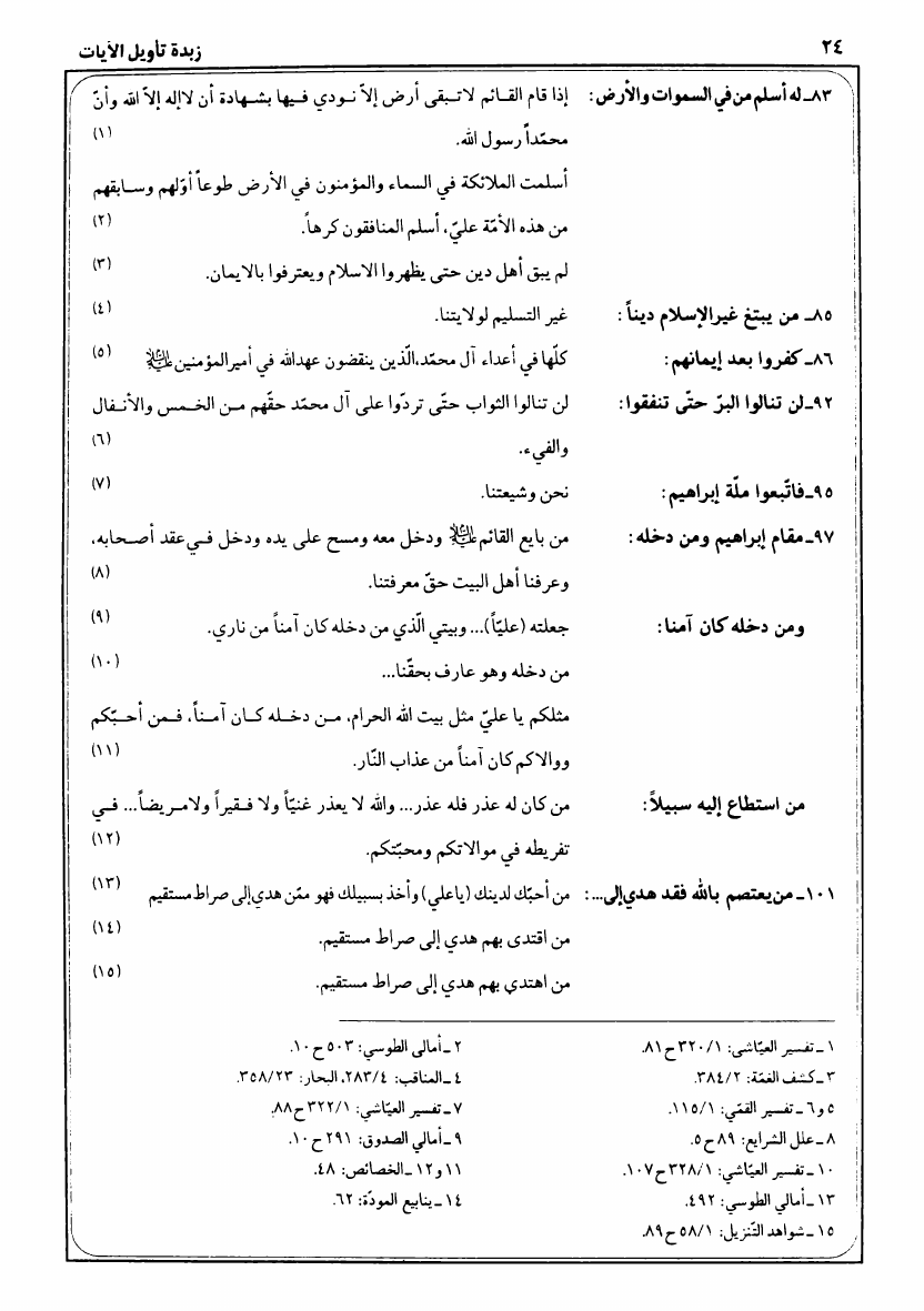 نام کتاب : زبدة تأويل الآيات النازلة في فضائل العترة الطاهرة ع، بديعة مأثورة من كتب التفسير والرواية نویسنده : السيد محمد باقر موحد الأبطحي جلد : 1 صفحه : 24