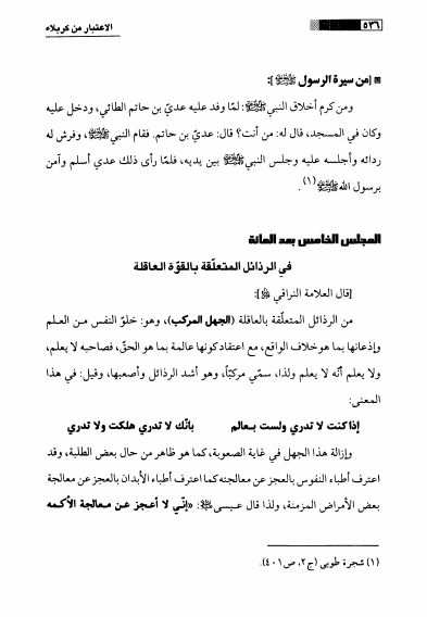 نام کتاب : الإعتبار في كربلاء ، تطبيقات تأريخية على مفردات أخلاقية من جامع السعادات للعلامة النراقي نویسنده : السيد حسين بن السيد شبر التوبلي البحراني جلد : 1 صفحه : 536