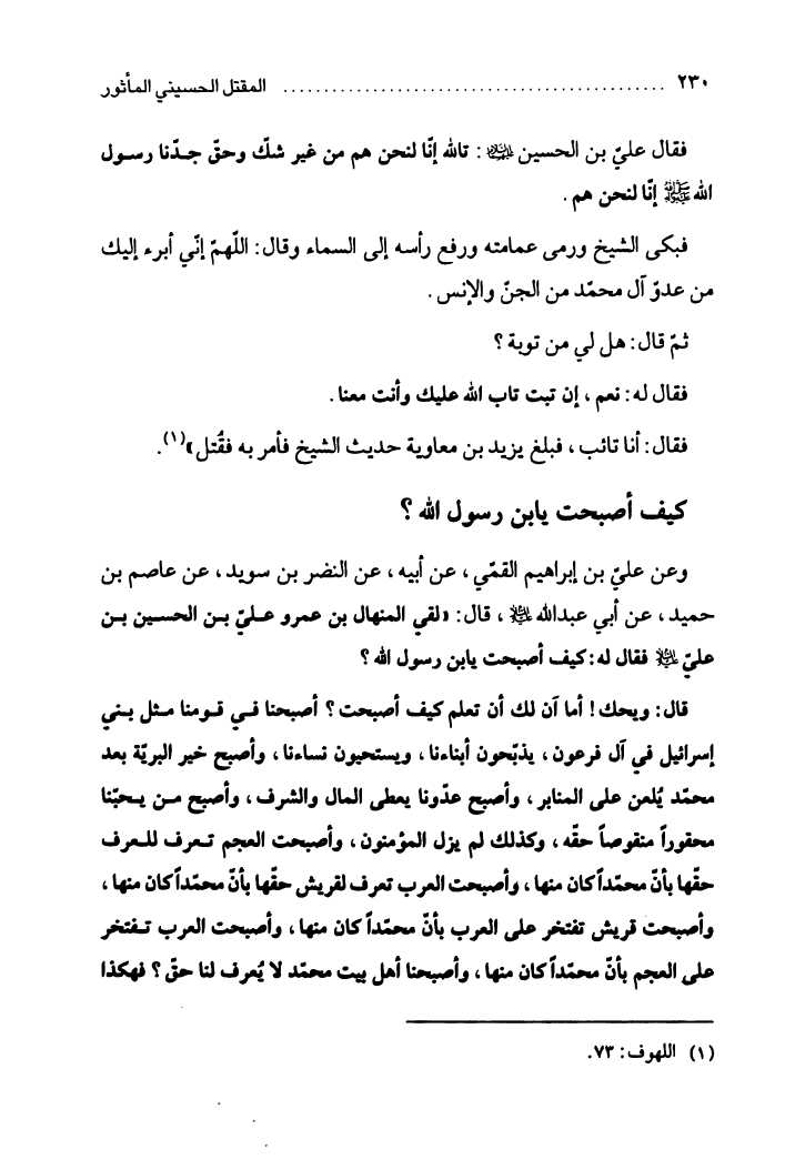 المقتل الحسيني المأثور، عرض روائي لأحداث كربلاء على لسان المعصومين
