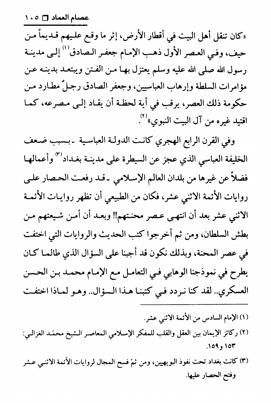 نام کتاب : تجربتي مع الامام محمد بن الحسن العسكري ، المنهج الصحيح في عرض حقيقة غيبة الإمام المهدي على الوهابيين نویسنده : الدكتور عصام العماد جلد : 1 صفحه : 105