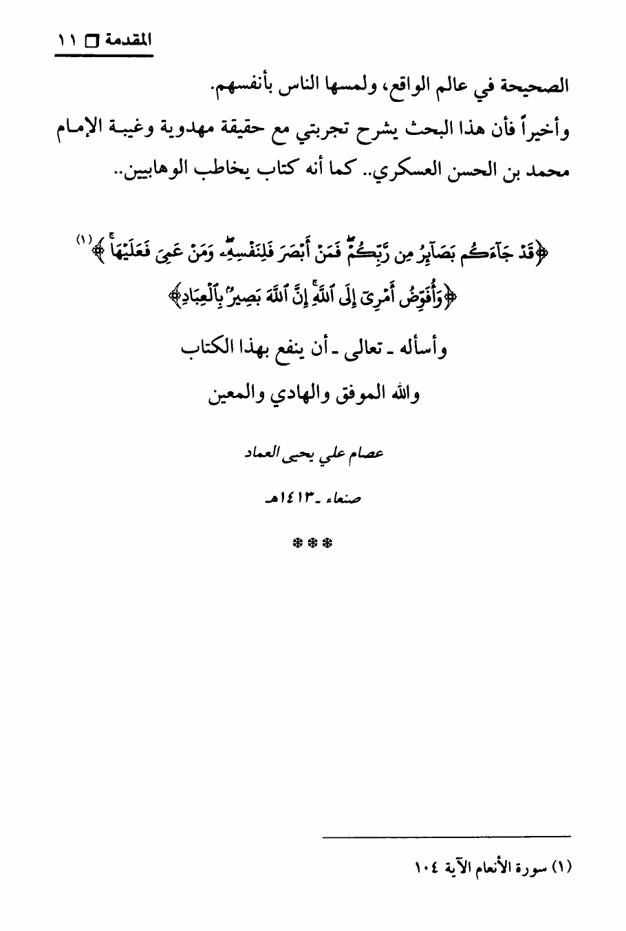نام کتاب : تجربتي مع الامام محمد بن الحسن العسكري ، المنهج الصحيح في عرض حقيقة غيبة الإمام المهدي على الوهابيين نویسنده : الدكتور عصام العماد جلد : 1 صفحه : 11
