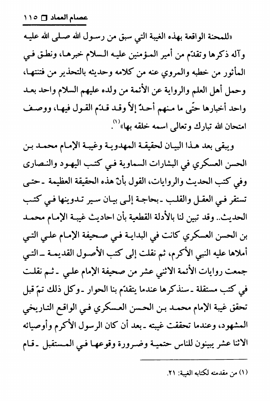 نام کتاب : تجربتي مع الامام محمد بن الحسن العسكري ، المنهج الصحيح في عرض حقيقة غيبة الإمام المهدي على الوهابيين نویسنده : الدكتور عصام العماد جلد : 1 صفحه : 115