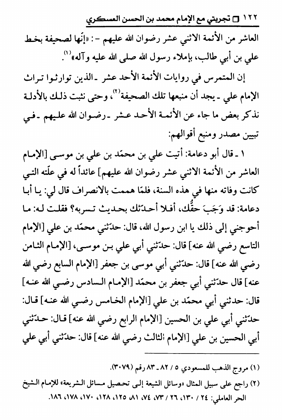 نام کتاب : تجربتي مع الامام محمد بن الحسن العسكري ، المنهج الصحيح في عرض حقيقة غيبة الإمام المهدي على الوهابيين نویسنده : الدكتور عصام العماد جلد : 1 صفحه : 122