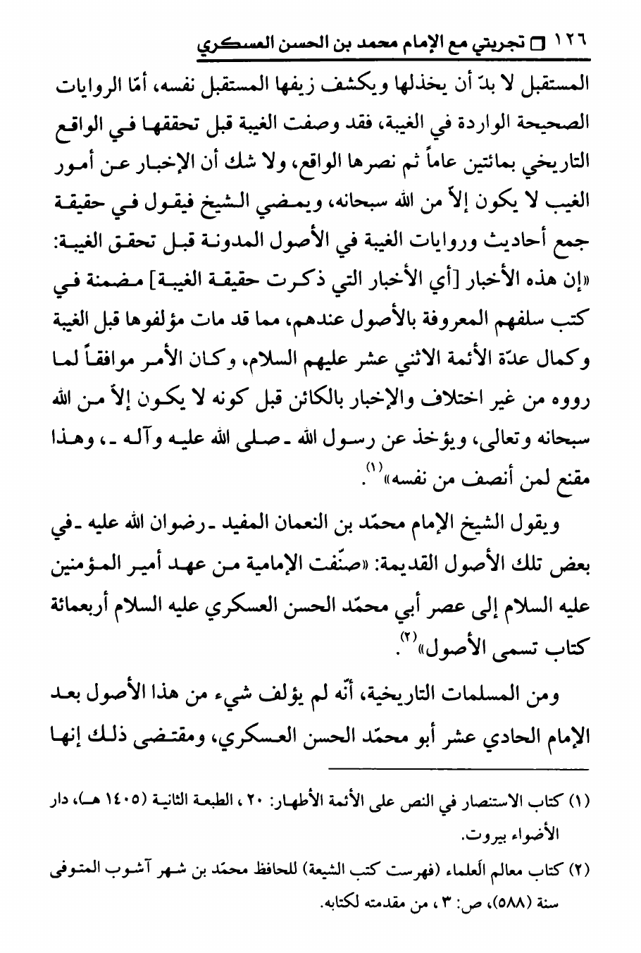 نام کتاب : تجربتي مع الامام محمد بن الحسن العسكري ، المنهج الصحيح في عرض حقيقة غيبة الإمام المهدي على الوهابيين نویسنده : الدكتور عصام العماد جلد : 1 صفحه : 126