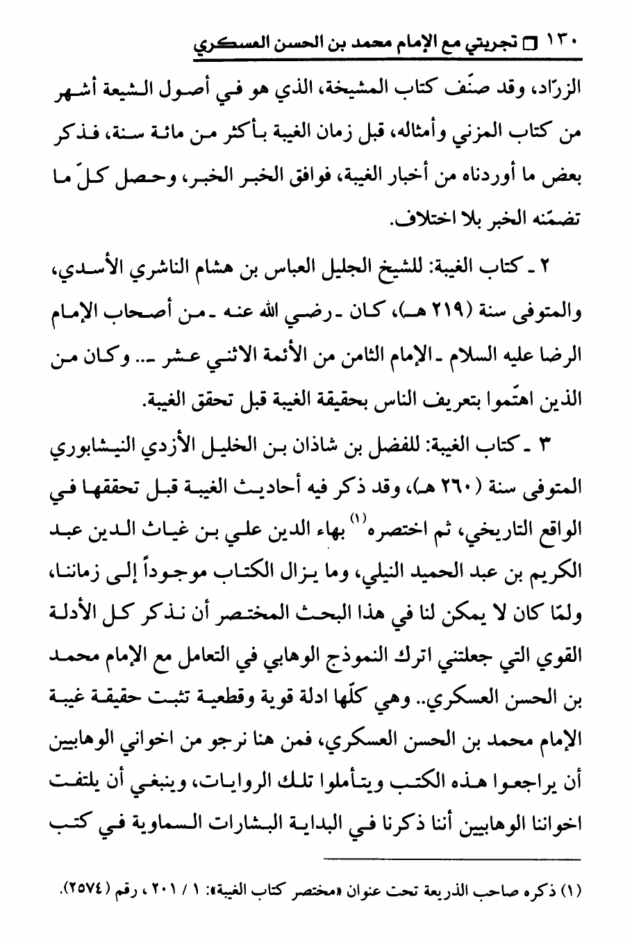 نام کتاب : تجربتي مع الامام محمد بن الحسن العسكري ، المنهج الصحيح في عرض حقيقة غيبة الإمام المهدي على الوهابيين نویسنده : الدكتور عصام العماد جلد : 1 صفحه : 130
