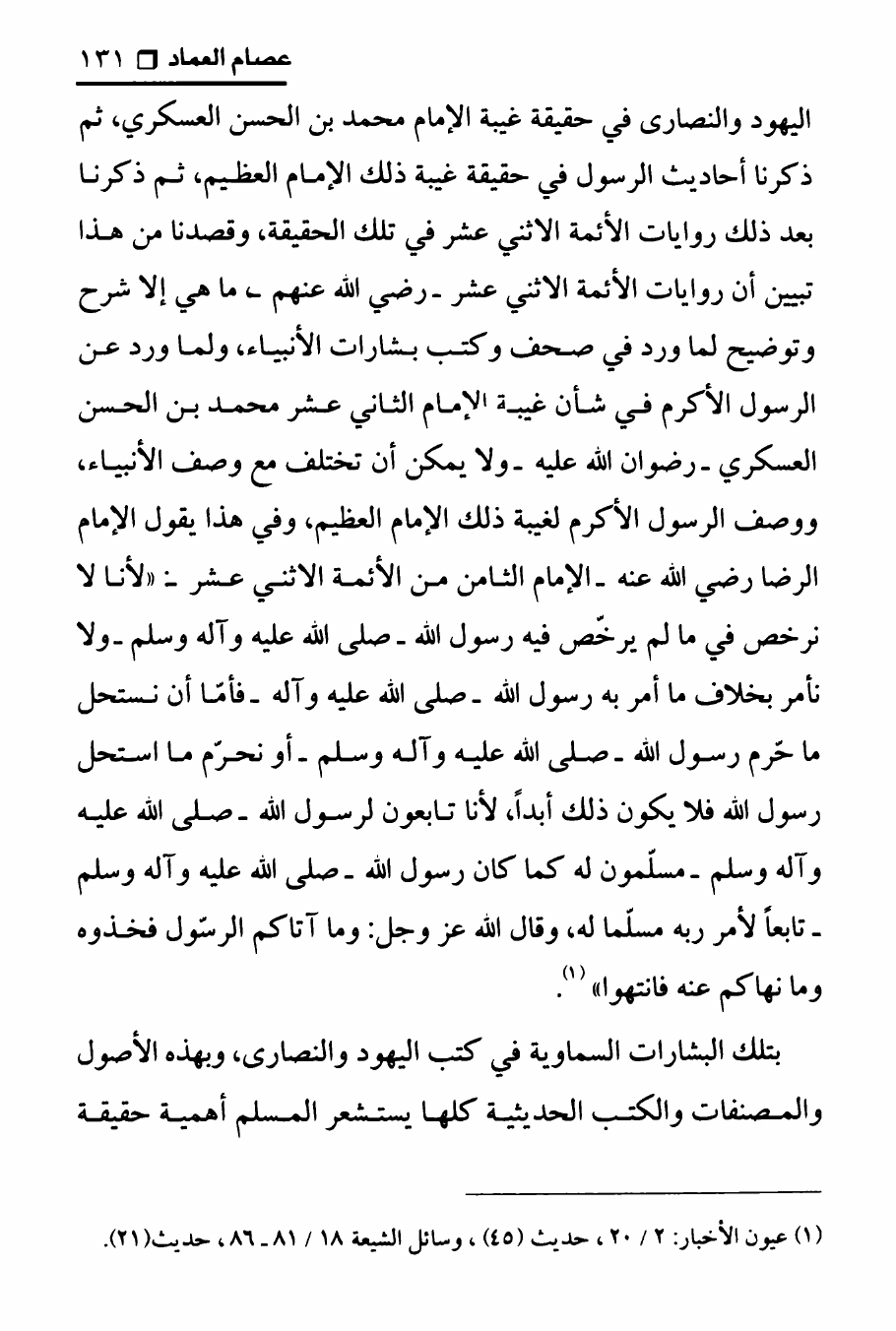 نام کتاب : تجربتي مع الامام محمد بن الحسن العسكري ، المنهج الصحيح في عرض حقيقة غيبة الإمام المهدي على الوهابيين نویسنده : الدكتور عصام العماد جلد : 1 صفحه : 131
