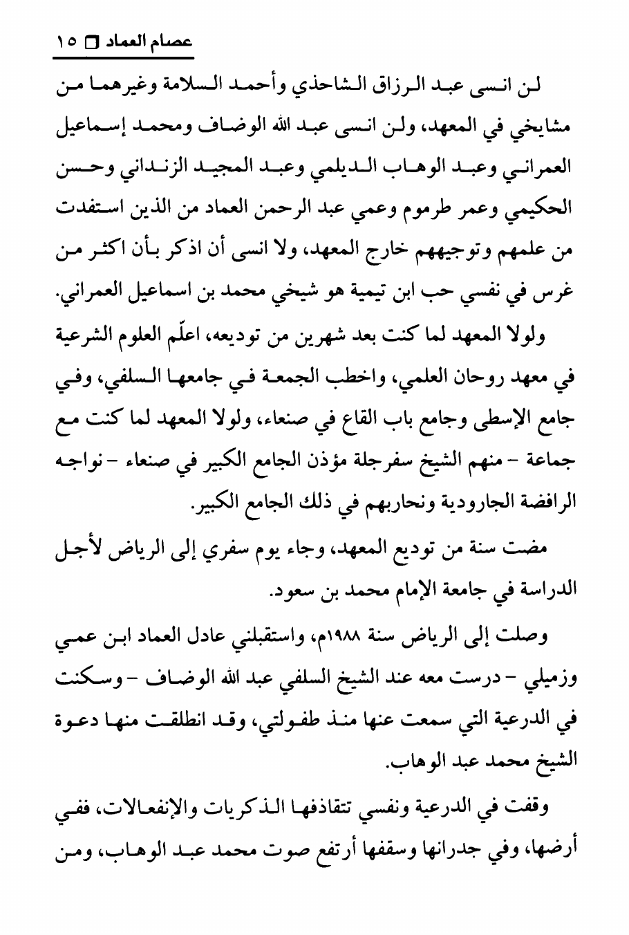 نام کتاب : تجربتي مع الامام محمد بن الحسن العسكري ، المنهج الصحيح في عرض حقيقة غيبة الإمام المهدي على الوهابيين نویسنده : الدكتور عصام العماد جلد : 1 صفحه : 15