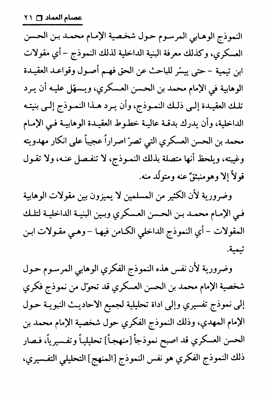 نام کتاب : تجربتي مع الامام محمد بن الحسن العسكري ، المنهج الصحيح في عرض حقيقة غيبة الإمام المهدي على الوهابيين نویسنده : الدكتور عصام العماد جلد : 1 صفحه : 21