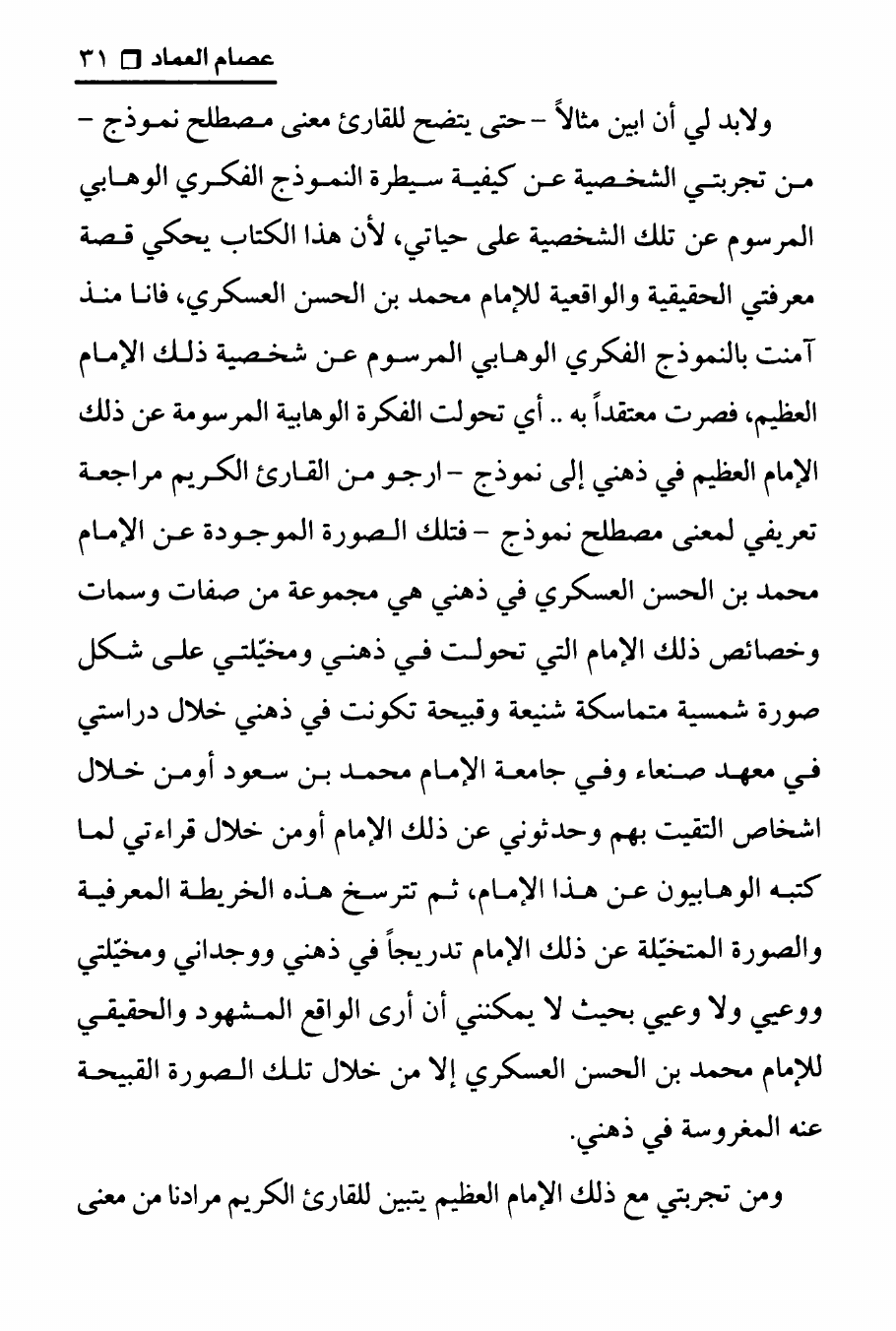 نام کتاب : تجربتي مع الامام محمد بن الحسن العسكري ، المنهج الصحيح في عرض حقيقة غيبة الإمام المهدي على الوهابيين نویسنده : الدكتور عصام العماد جلد : 1 صفحه : 31
