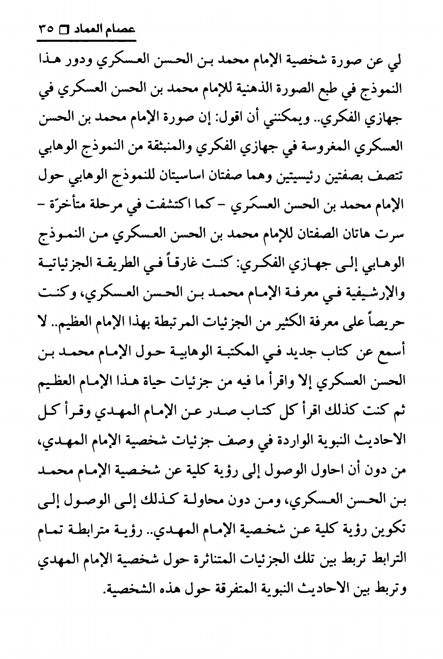 نام کتاب : تجربتي مع الامام محمد بن الحسن العسكري ، المنهج الصحيح في عرض حقيقة غيبة الإمام المهدي على الوهابيين نویسنده : الدكتور عصام العماد جلد : 1 صفحه : 35