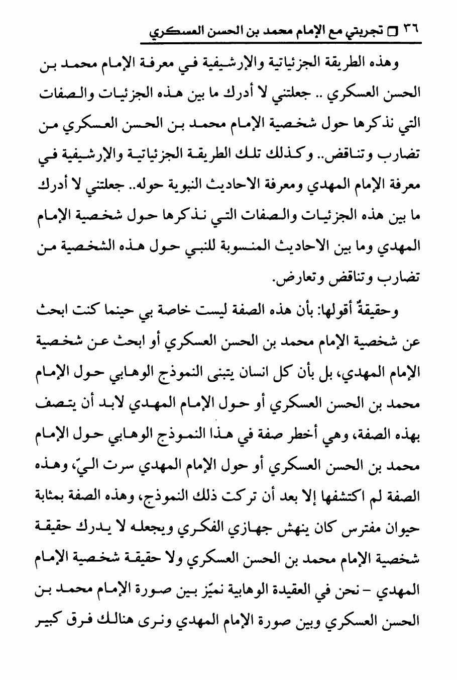 نام کتاب : تجربتي مع الامام محمد بن الحسن العسكري ، المنهج الصحيح في عرض حقيقة غيبة الإمام المهدي على الوهابيين نویسنده : الدكتور عصام العماد جلد : 1 صفحه : 36