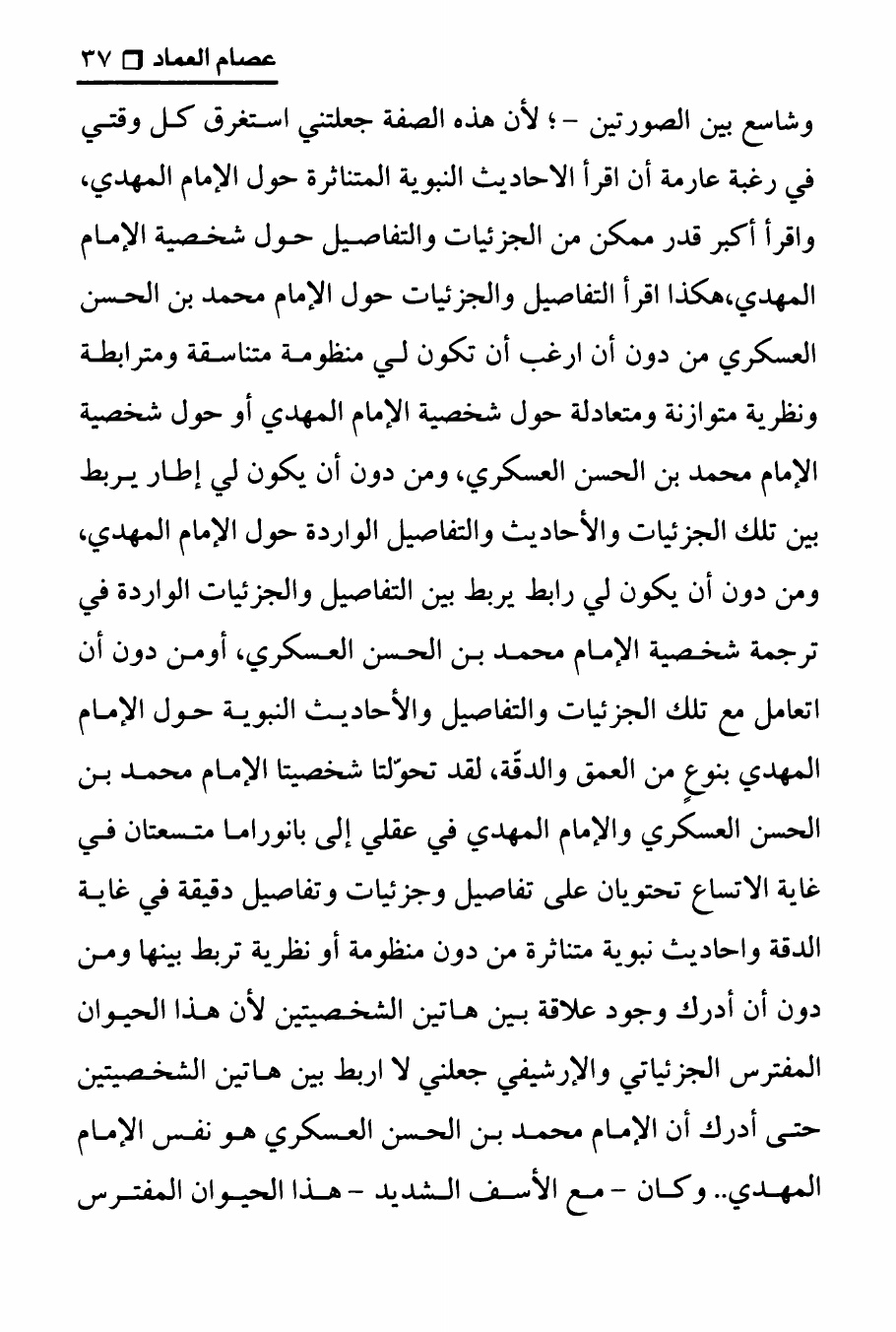 نام کتاب : تجربتي مع الامام محمد بن الحسن العسكري ، المنهج الصحيح في عرض حقيقة غيبة الإمام المهدي على الوهابيين نویسنده : الدكتور عصام العماد جلد : 1 صفحه : 37