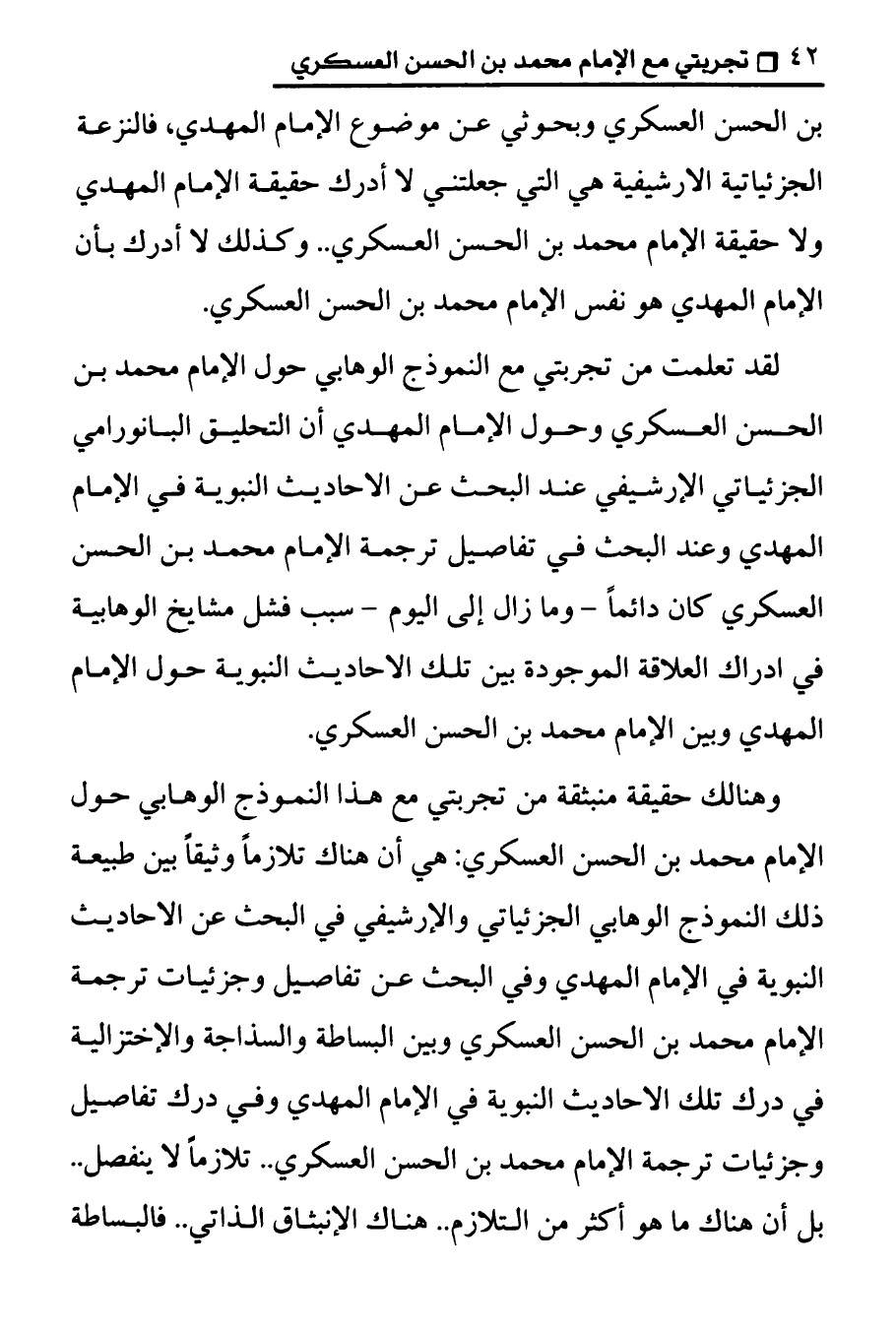 نام کتاب : تجربتي مع الامام محمد بن الحسن العسكري ، المنهج الصحيح في عرض حقيقة غيبة الإمام المهدي على الوهابيين نویسنده : الدكتور عصام العماد جلد : 1 صفحه : 42