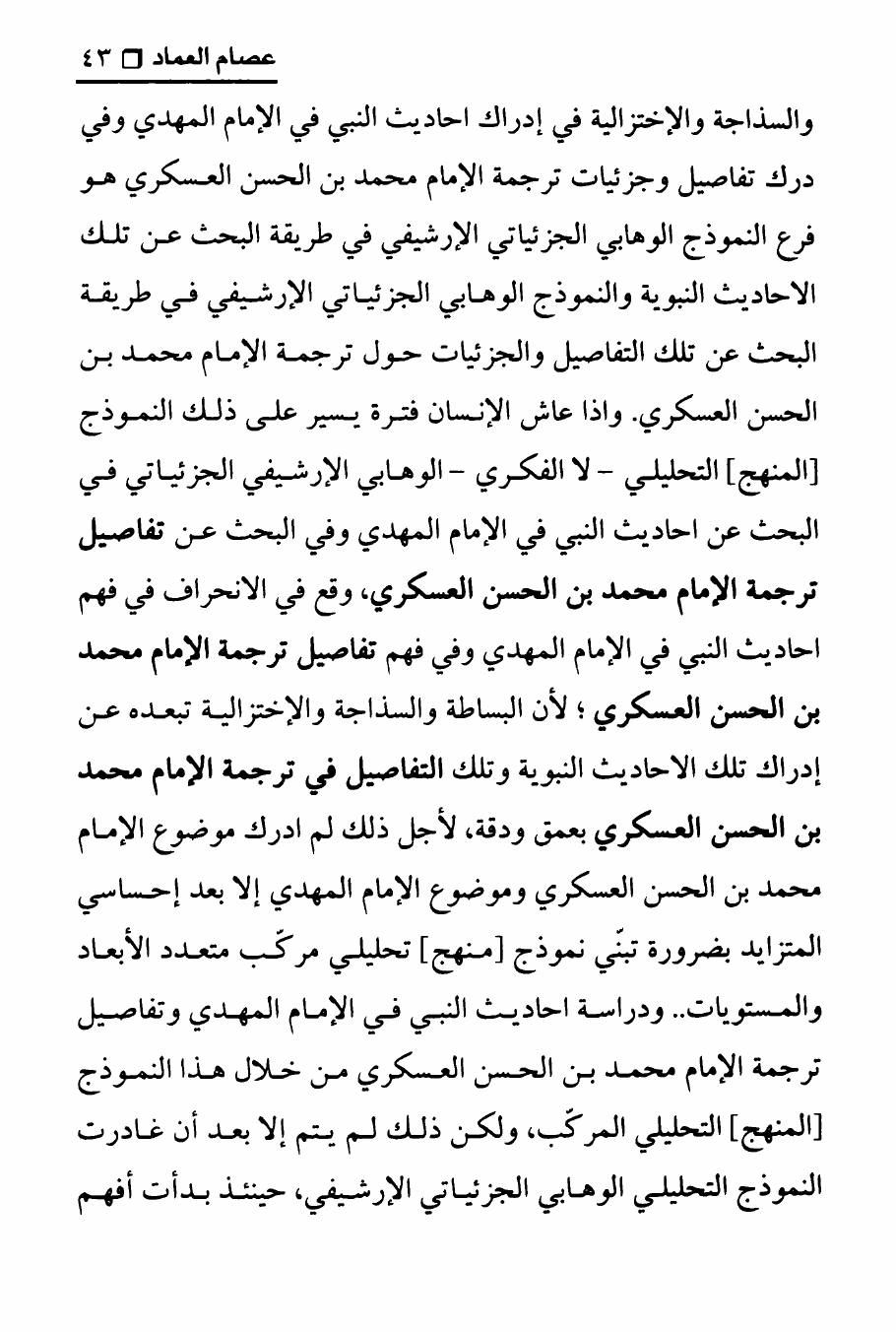 نام کتاب : تجربتي مع الامام محمد بن الحسن العسكري ، المنهج الصحيح في عرض حقيقة غيبة الإمام المهدي على الوهابيين نویسنده : الدكتور عصام العماد جلد : 1 صفحه : 43