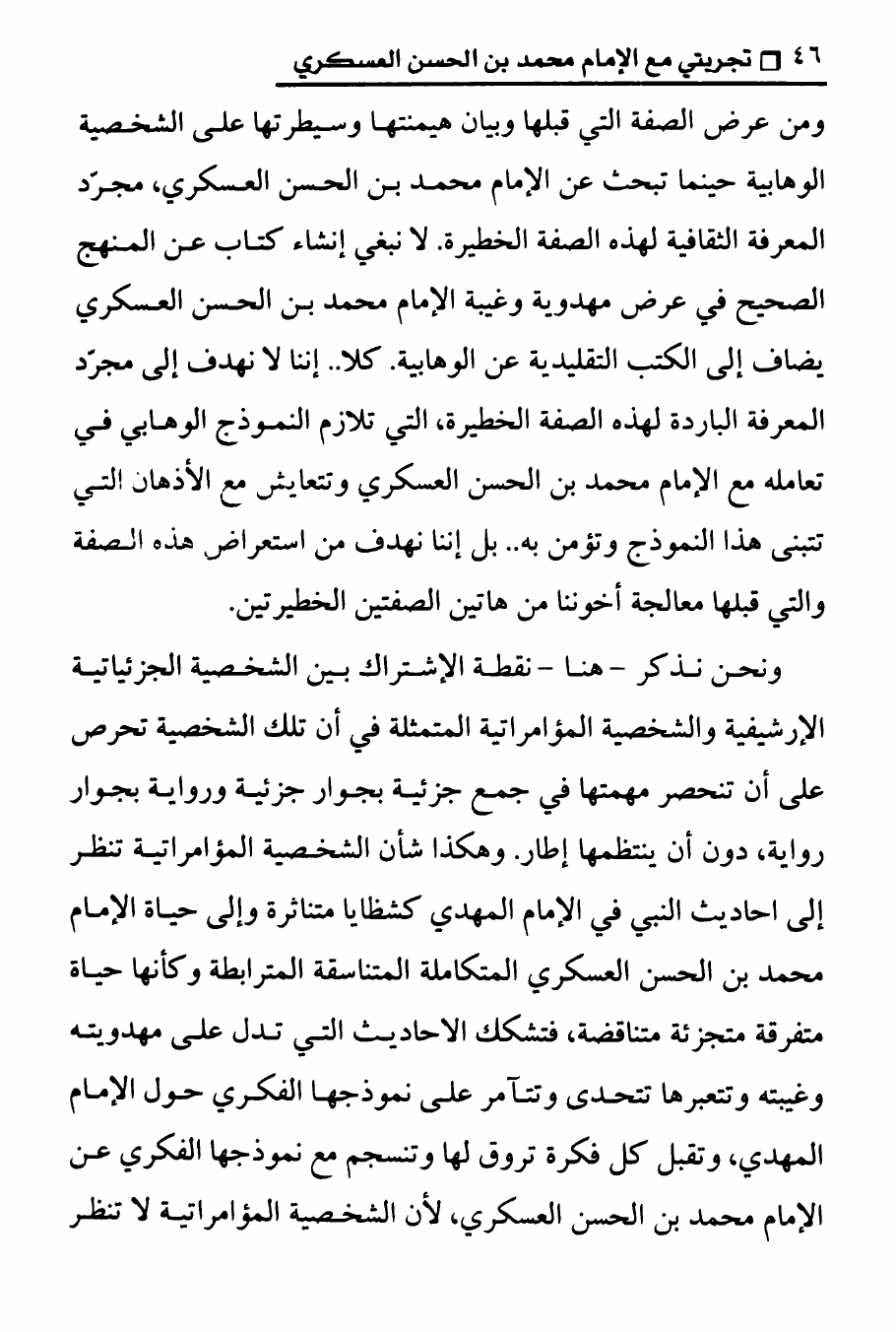نام کتاب : تجربتي مع الامام محمد بن الحسن العسكري ، المنهج الصحيح في عرض حقيقة غيبة الإمام المهدي على الوهابيين نویسنده : الدكتور عصام العماد جلد : 1 صفحه : 46