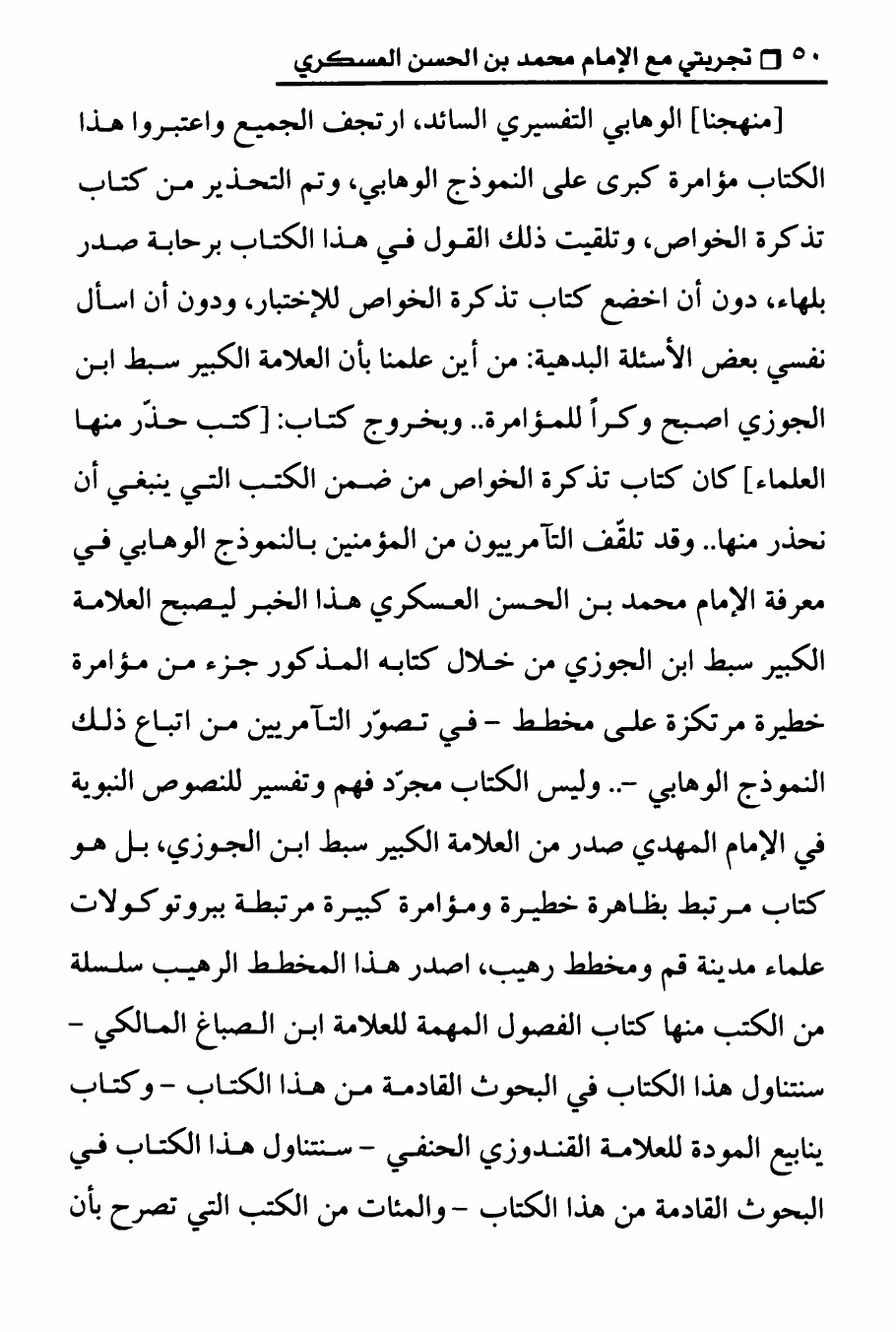 نام کتاب : تجربتي مع الامام محمد بن الحسن العسكري ، المنهج الصحيح في عرض حقيقة غيبة الإمام المهدي على الوهابيين نویسنده : الدكتور عصام العماد جلد : 1 صفحه : 50
