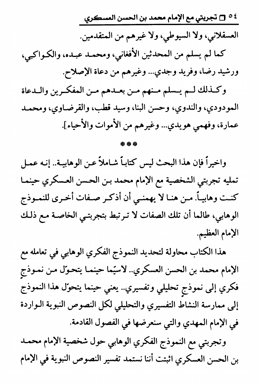 نام کتاب : تجربتي مع الامام محمد بن الحسن العسكري ، المنهج الصحيح في عرض حقيقة غيبة الإمام المهدي على الوهابيين نویسنده : الدكتور عصام العماد جلد : 1 صفحه : 54