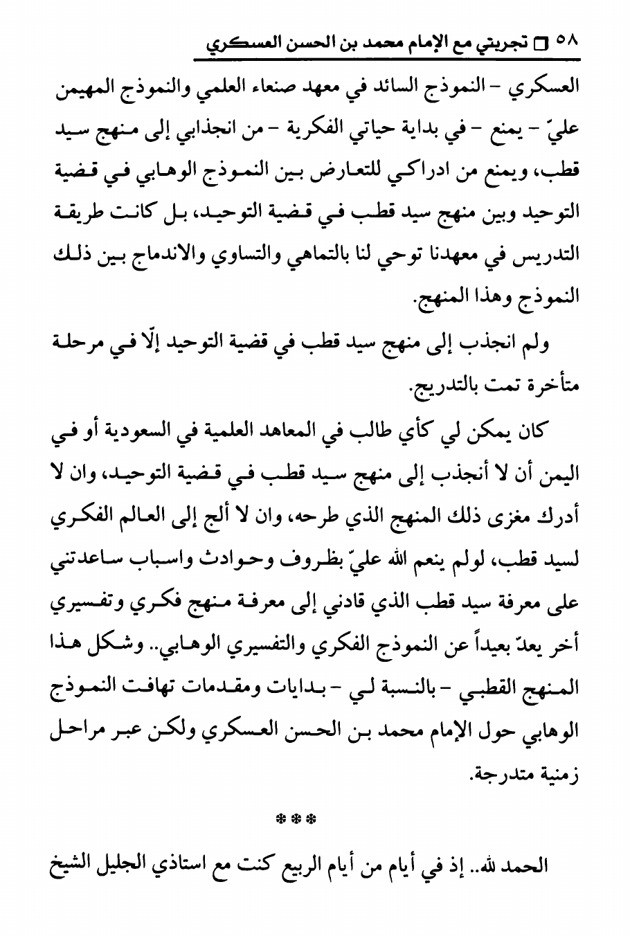 نام کتاب : تجربتي مع الامام محمد بن الحسن العسكري ، المنهج الصحيح في عرض حقيقة غيبة الإمام المهدي على الوهابيين نویسنده : الدكتور عصام العماد جلد : 1 صفحه : 58