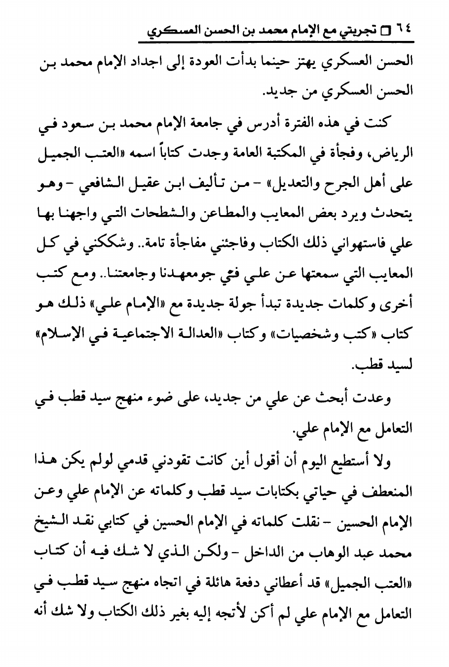 نام کتاب : تجربتي مع الامام محمد بن الحسن العسكري ، المنهج الصحيح في عرض حقيقة غيبة الإمام المهدي على الوهابيين نویسنده : الدكتور عصام العماد جلد : 1 صفحه : 64