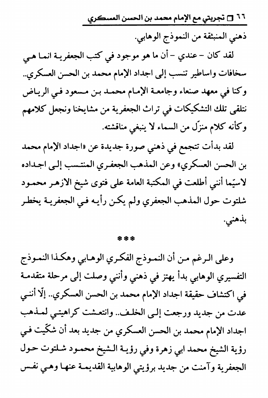 نام کتاب : تجربتي مع الامام محمد بن الحسن العسكري ، المنهج الصحيح في عرض حقيقة غيبة الإمام المهدي على الوهابيين نویسنده : الدكتور عصام العماد جلد : 1 صفحه : 66