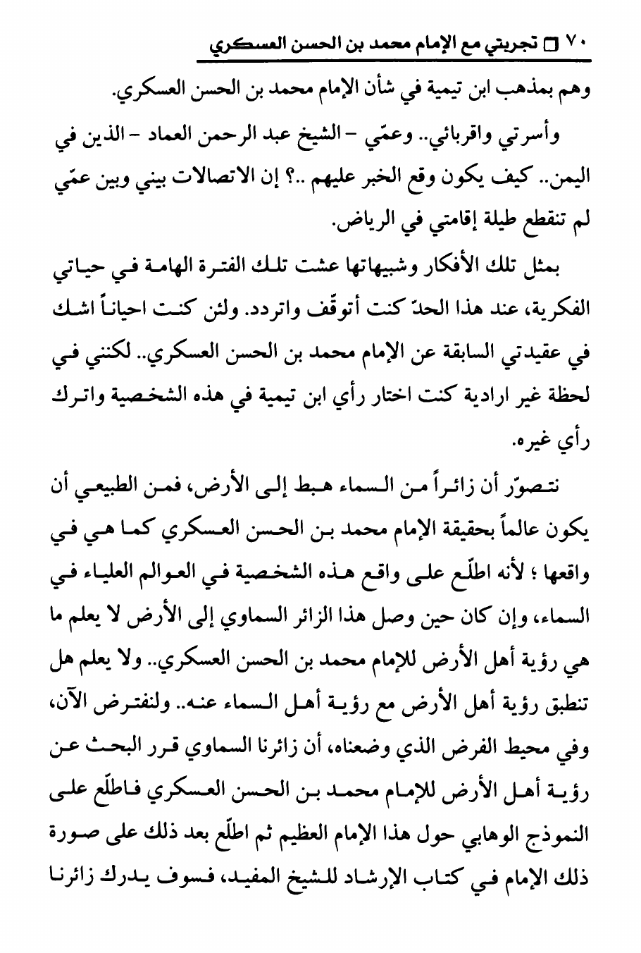 نام کتاب : تجربتي مع الامام محمد بن الحسن العسكري ، المنهج الصحيح في عرض حقيقة غيبة الإمام المهدي على الوهابيين نویسنده : الدكتور عصام العماد جلد : 1 صفحه : 70